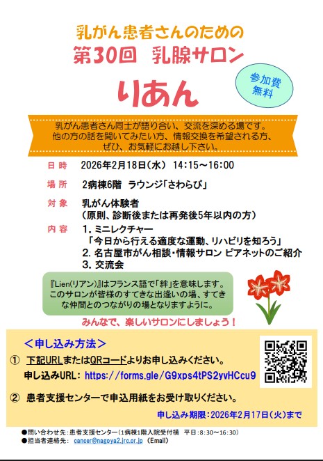 日本赤十字社愛知医療センター名古屋第二病院 第30回乳腺サロン「りあん」